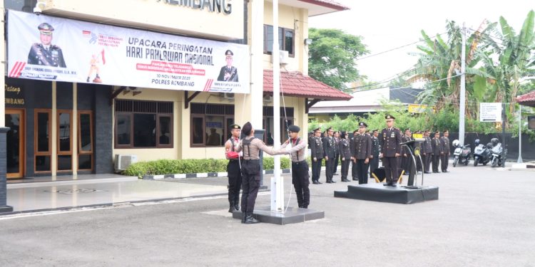 REMBANG – Polres Rembang Polda Jateng menggelar Upacara Peringatan Hari Pahlawan Tahun 2025 di Halaman Mapolres Rembang, Senin (10/11/2025) pagi. Kegiatan tersebut dipimpin oleh Wakapolres Rembang Kompol M. Fadhlan, S.H.,S.I.K.,M.H. dengan diikuti oleh para Pejabat Utama Polres, personel Polri, ASN, serta perwakilan Polsek jajaran.
