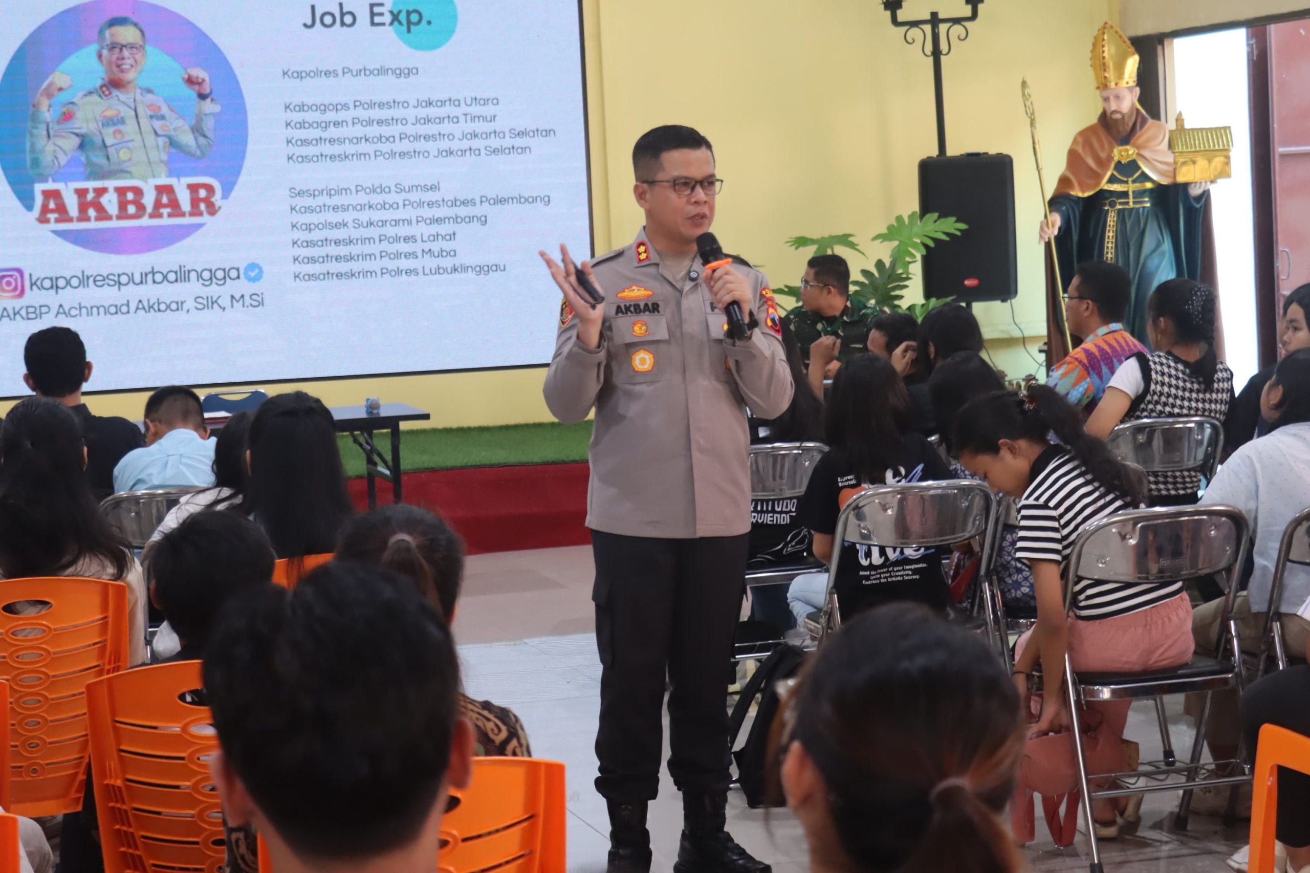 Polres Purbalingga – Kapolres Purbalingga AKBP Achmad Akbar menjadi narasumber dalam Seminar Kebangsaan bertajuk Be A Leader yang digelar di Aula Gereja Katolik Santo Agustinus, Purbalingga, Minggu (12/10/2025). Kegiatan ini diikuti oleh puluhan remaja dan pemuda gereja.