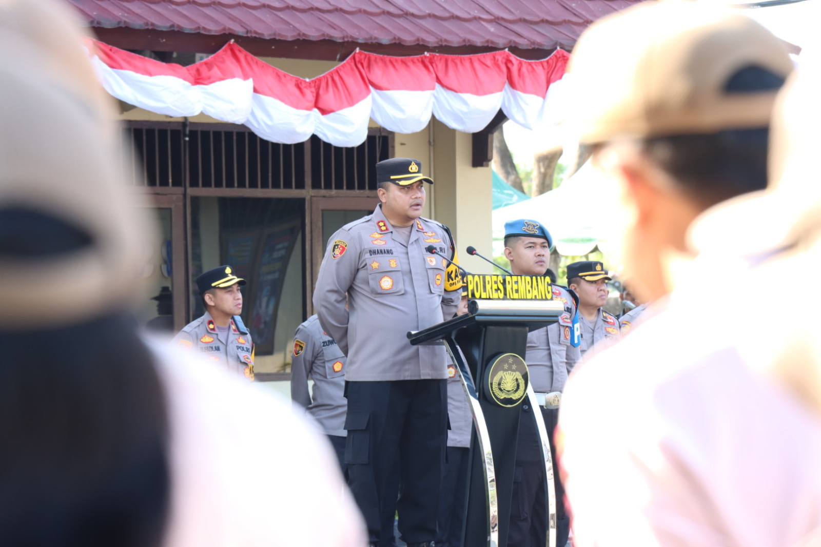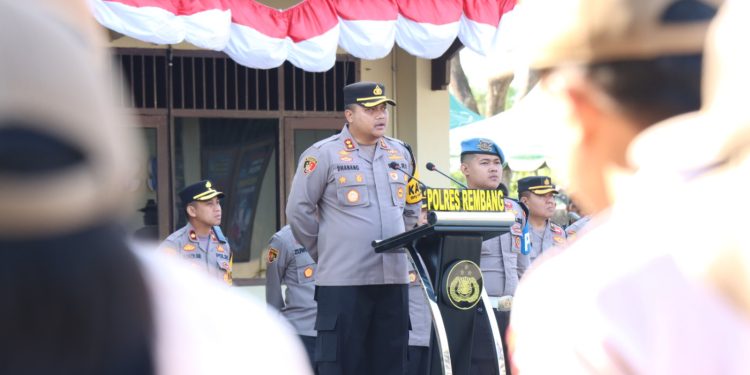 REMBANG – Kapolres Rembang Polda Jateng AKBP Dhanang Bagus Anggoro, S.I.K., M.H. memimpin langsung apel jam pimpinan di halaman Mapolres Rembang, Senin (21/7/2025).