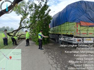 Pohon trembesi berukuran besar tumbang dan melintang di ruas Jalan Jalur Lingkar Selatan (JLS), turut Desa Penambuhan, Kecamatan Margorejo, Kabupaten Pati, Minggu (1/2/2026) sekitar pukul 10.45 WIB. Peristiwa ini sempat mengganggu arus lalu lintas dari arah Pati menuju Kudus.