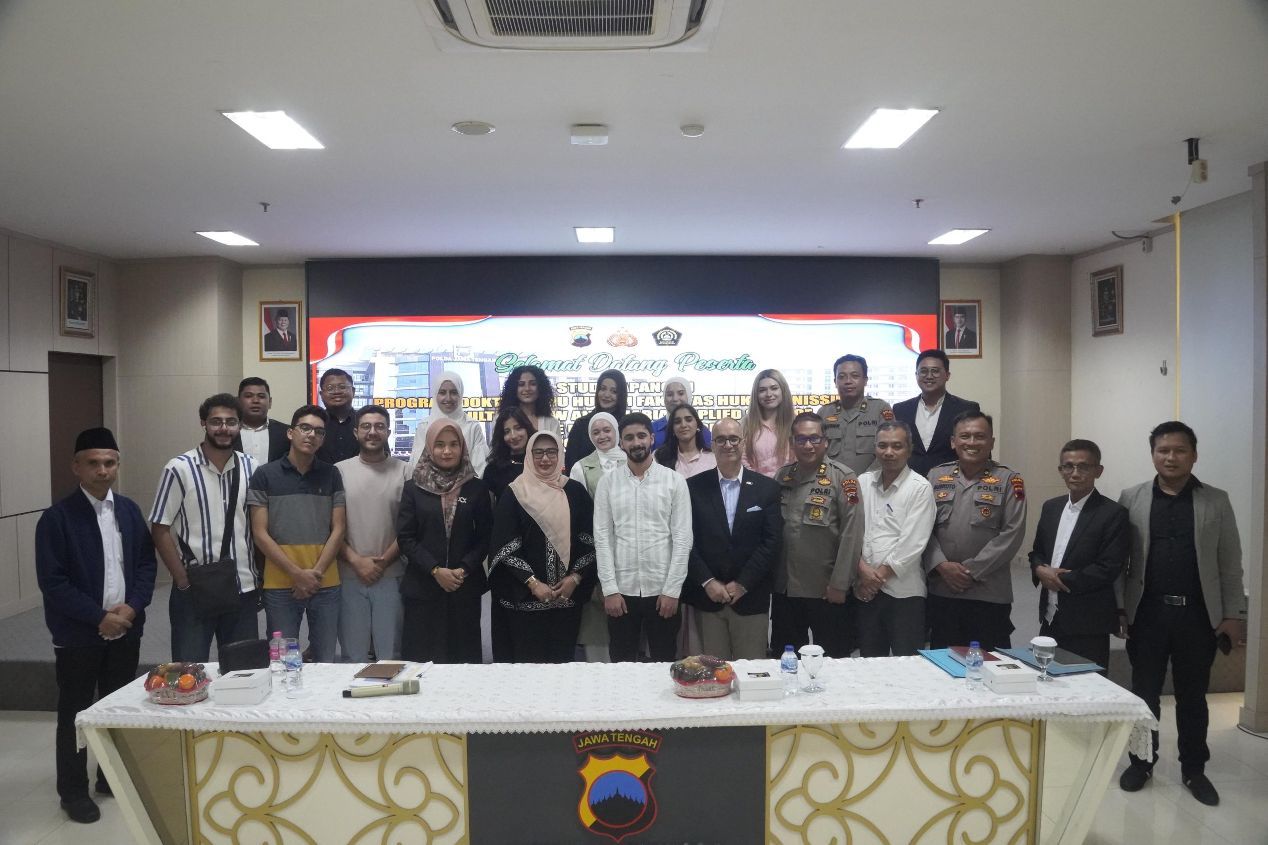 Kunjungan ini merupakan bagian dari kegiatan Studi Lapangan Program Doktor Ilmu Hukum Fakultas Hukum Universitas Islam Sultan Agung (Unissula) bersama Faculty of Law and Sharia, Applied Science Private University of Jordan. Rombongan diterima oleh Wakapolda Jateng Brigjen Pol Latif Usman bersama Kabidkum Polda Jateng Kombes Pol Zainal Rio Chandra Tangkari dan dilanjutkan dengan diskusi di Aula lantai 2 Mapolda Jateng yang diikuti oleh sekitar 100 orang peserta yang terdiri dari dosen, mahasiswa program doktor Unissula, serta personel Polda Jateng.