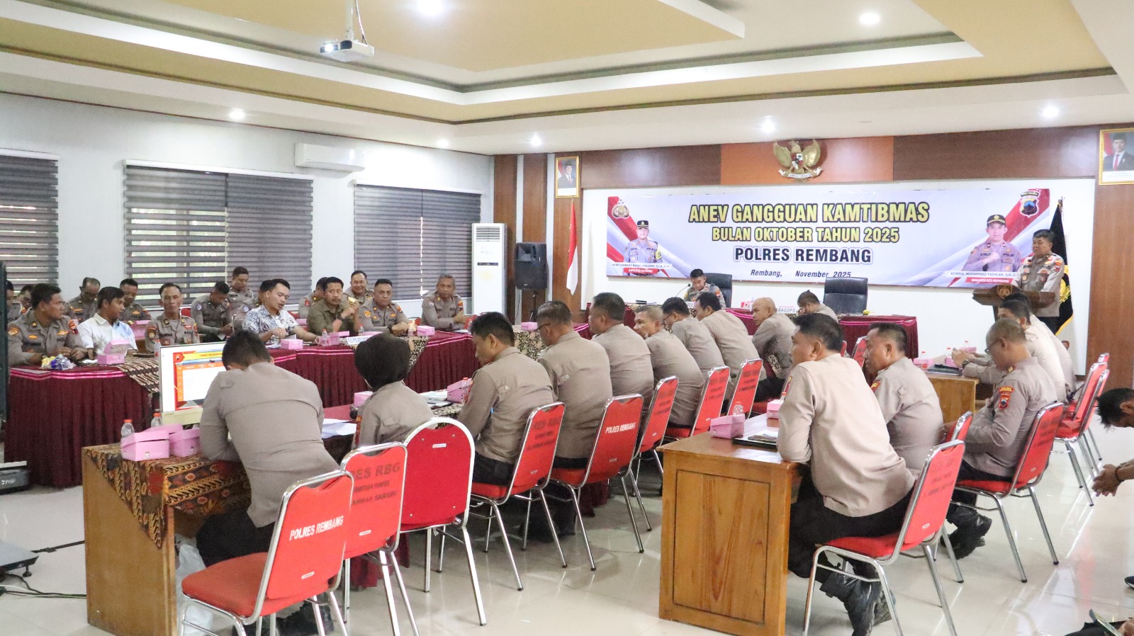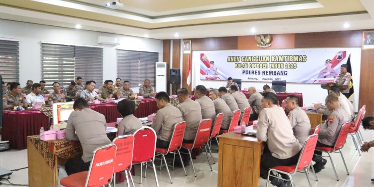 REMBANG – Polres Rembang menggelar kegiatan Analisa dan Evaluasi (Anev) Gangguan Kamtibmas periode Bulan Oktober Tahun 2025 di Aula Sarja Arya Racana Mapolres Rembang, Jum’at (14/11/2025) siang.