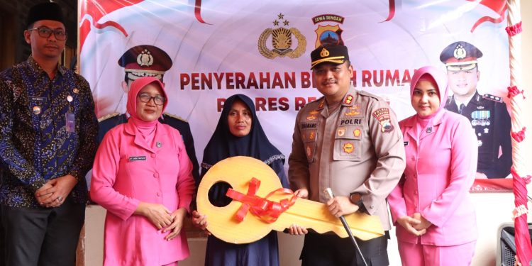 REMBANG – Jajaran Polres Rembang Polda Jateng melaksanakan kegiatan penyerahan rumah hasil program Bedah Rumah Polri untuk Masyarakat serta bantuan sosial (bansos) tahun 2025 kepada warga Desa Narukan, Kecamatan Kragan, Kabupaten Rembang, Selasa (30/09/2025) siang.
