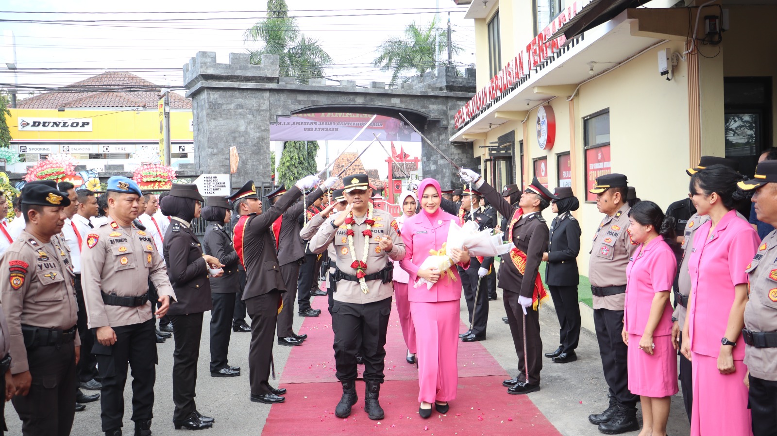 Jajaran perwira Polres Rembang berjajar rapi mengiringi langkah Kapolres beserta Ibu Ketua Bhayangkari memasuki Mapolres Rembang.