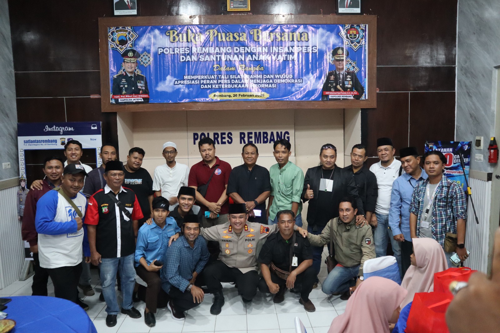REMBANG – Dalam rangka mempererat tali silaturahmi serta sebagai bentuk apresiasi terhadap peran pers dalam menjaga demokrasi dan keterbukaan informasi, Polres Rembang menggelar kegiatan Buka Puasa Bersama insan pers dan santunan anak yatim, Kamis (26/2/2026) pukul 17.30 WIB. Kegiatan tersebut berlangsung di Aula Sat Lantas Polres Rembang.